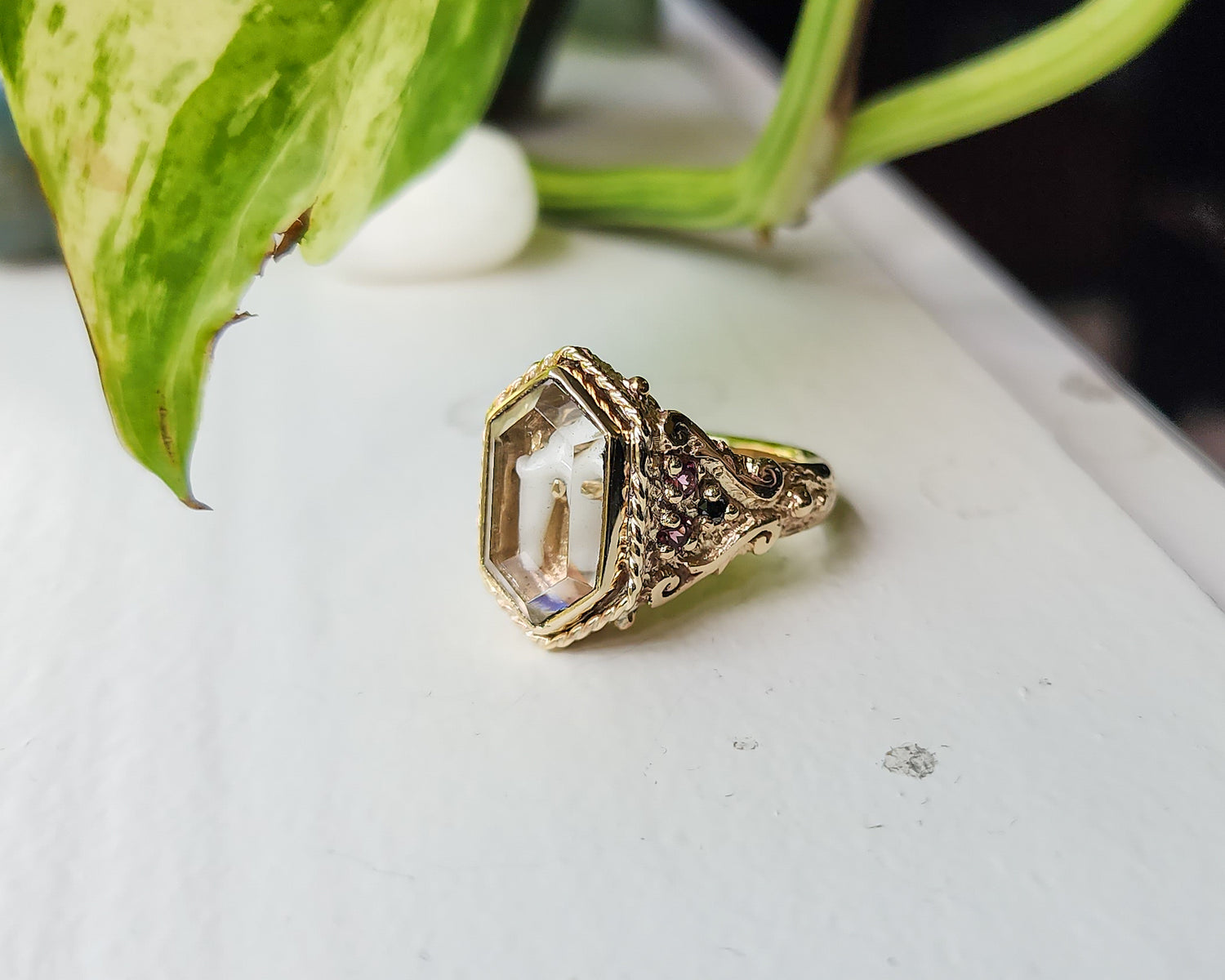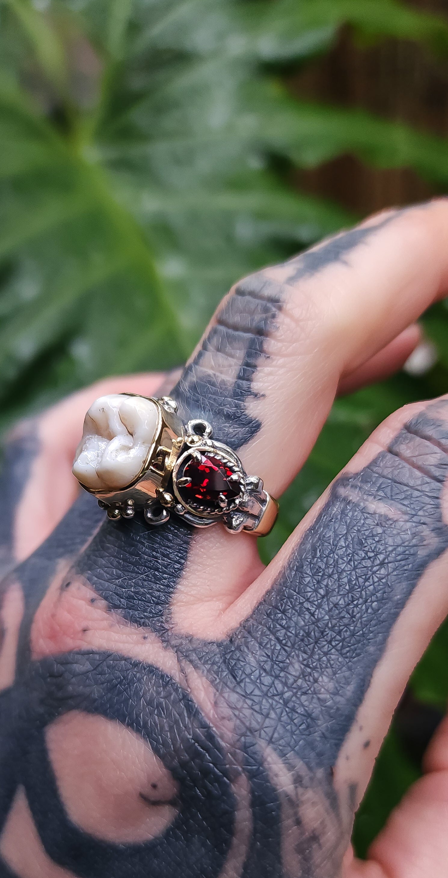 18ct rose gold wedding ring, set with a spouse's tooth, complimented by a black spinel and blood red garnet halo