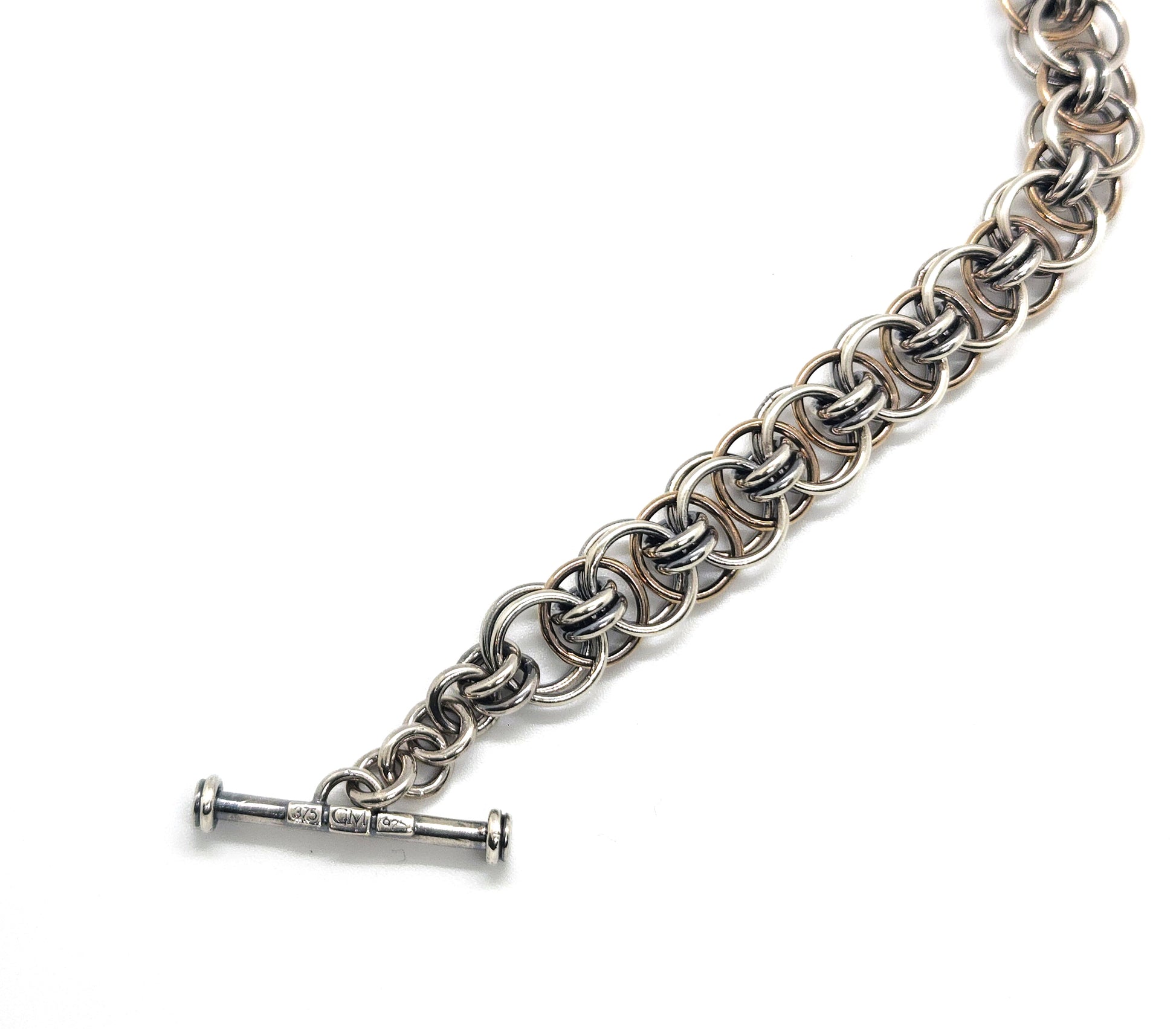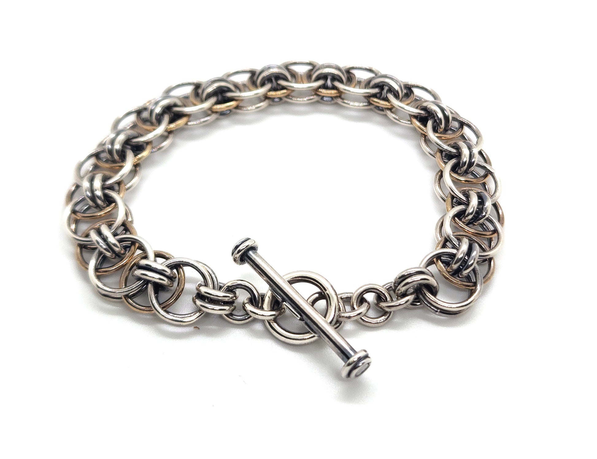 This classic style Helm chainmail chain is handmade in sterling silver & 9ct yellow gold, fitted with a hallmarked T-bar closure. Each link has been soldered together to ensure extra strength and longevity of the chain.