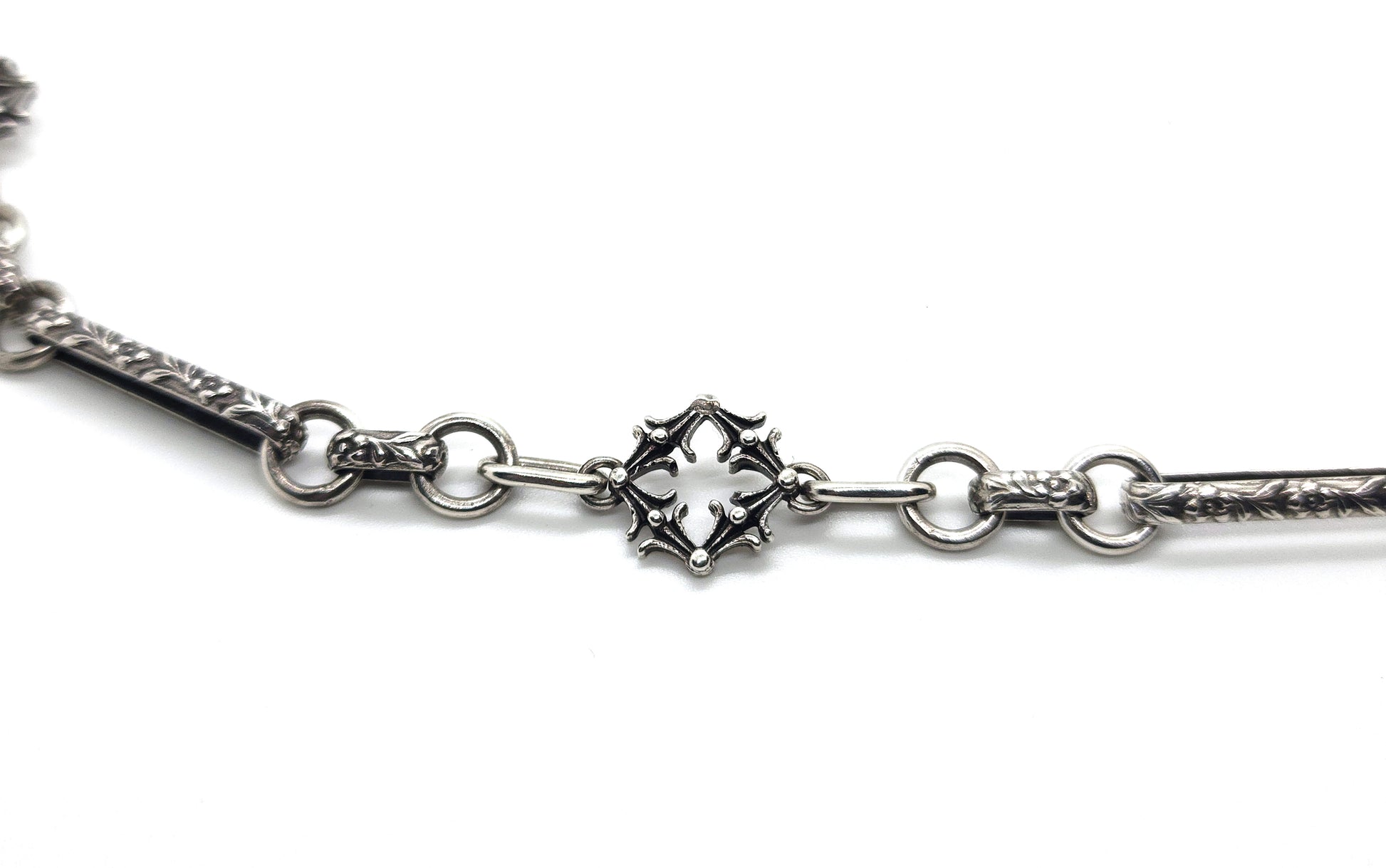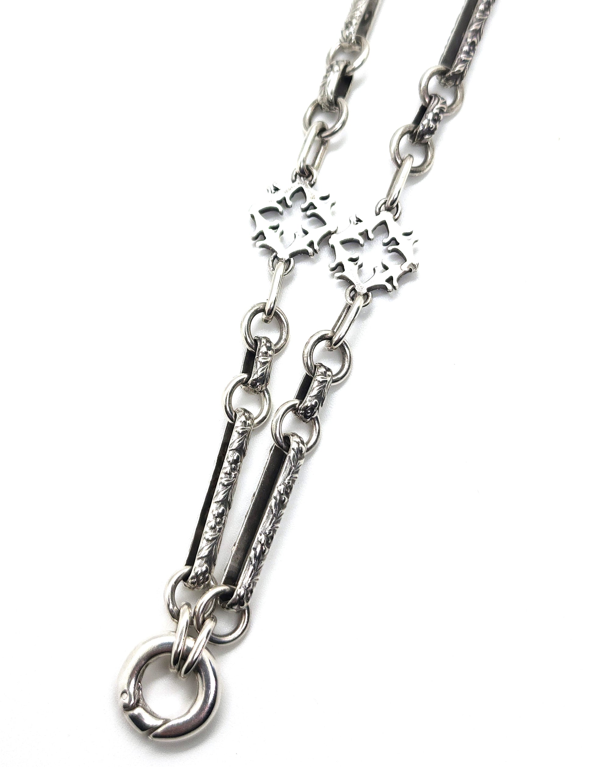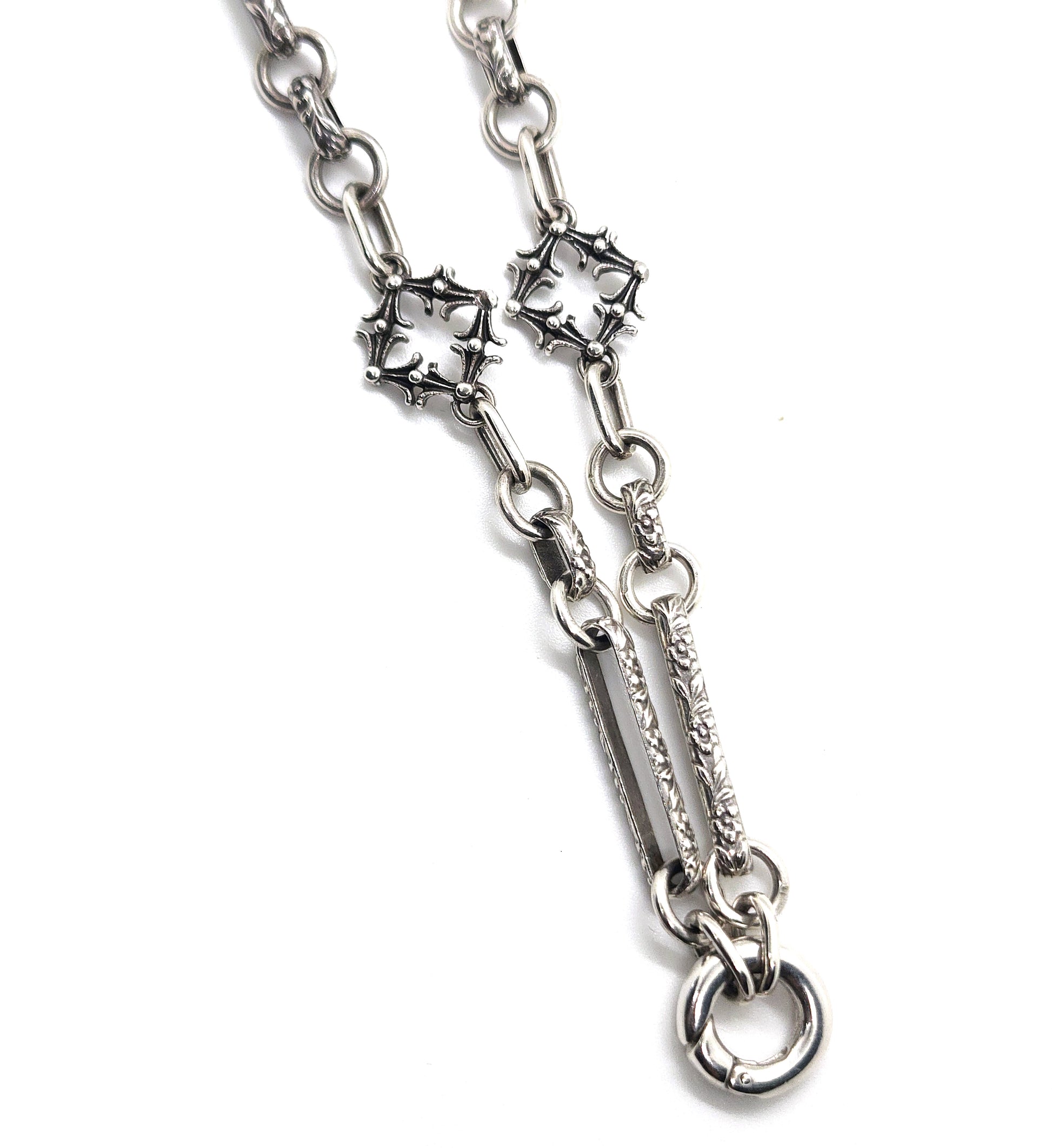 This silver chain, inspired by Victorian extravagance, showcases quatrefoil links and intricately adorned elements, complete with a snap ring at the front for attaching rings, pendants, or charms. Custom lengths are available, please email to receive a quote for your desired length