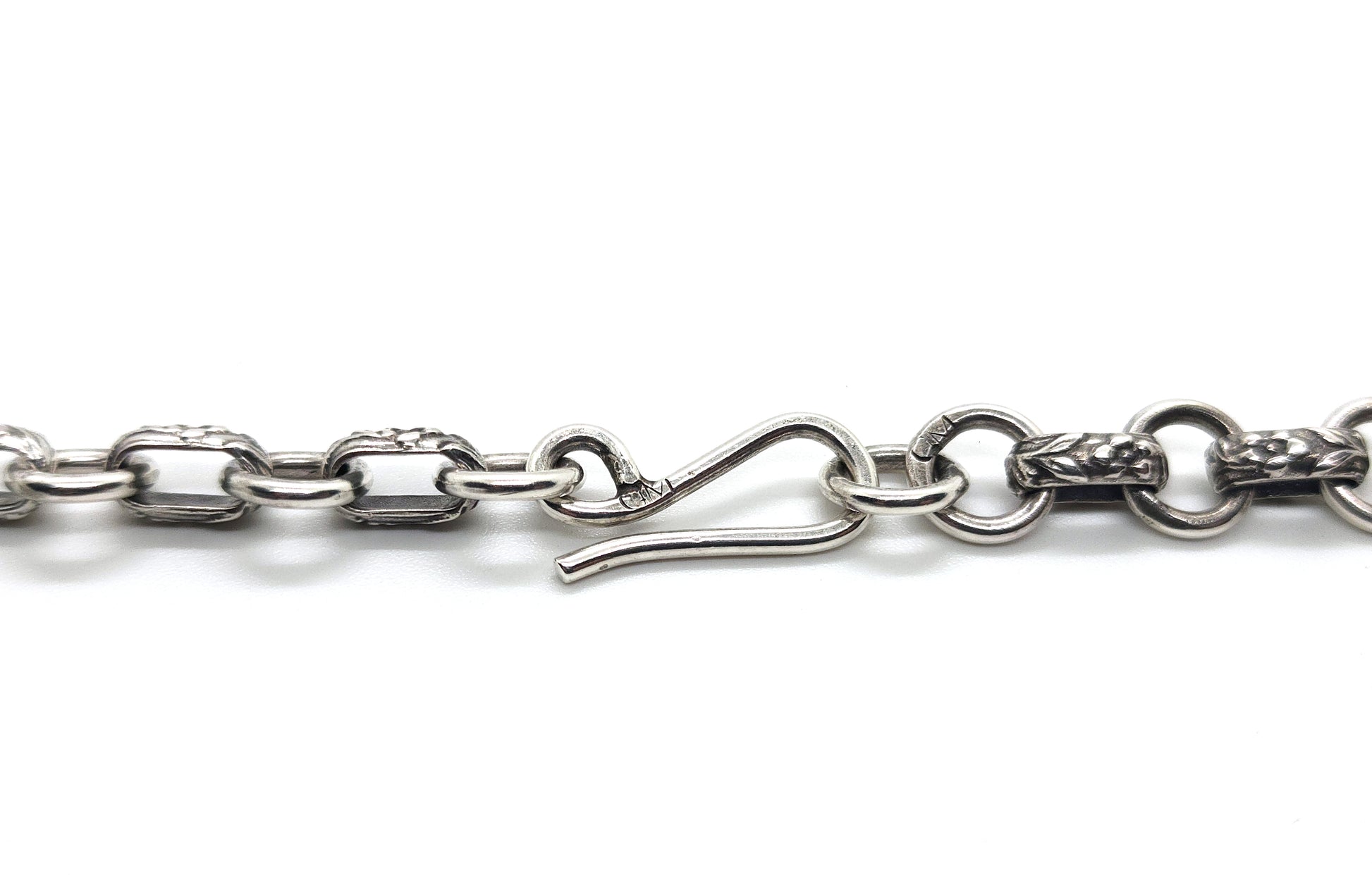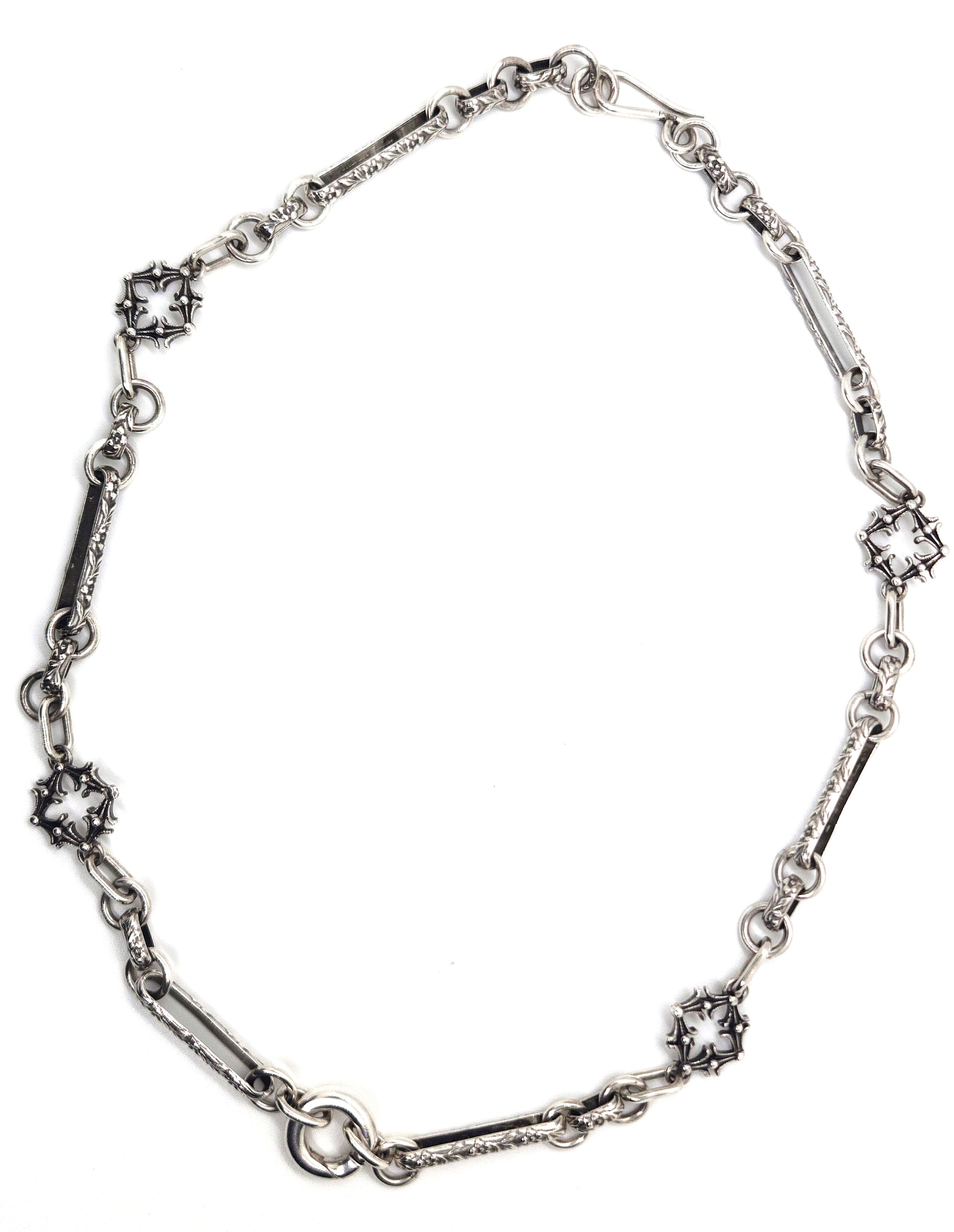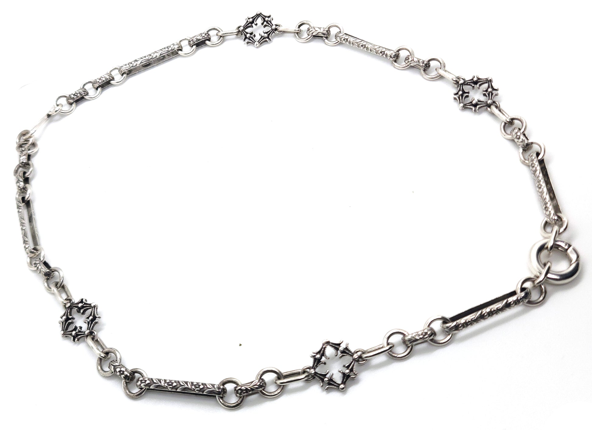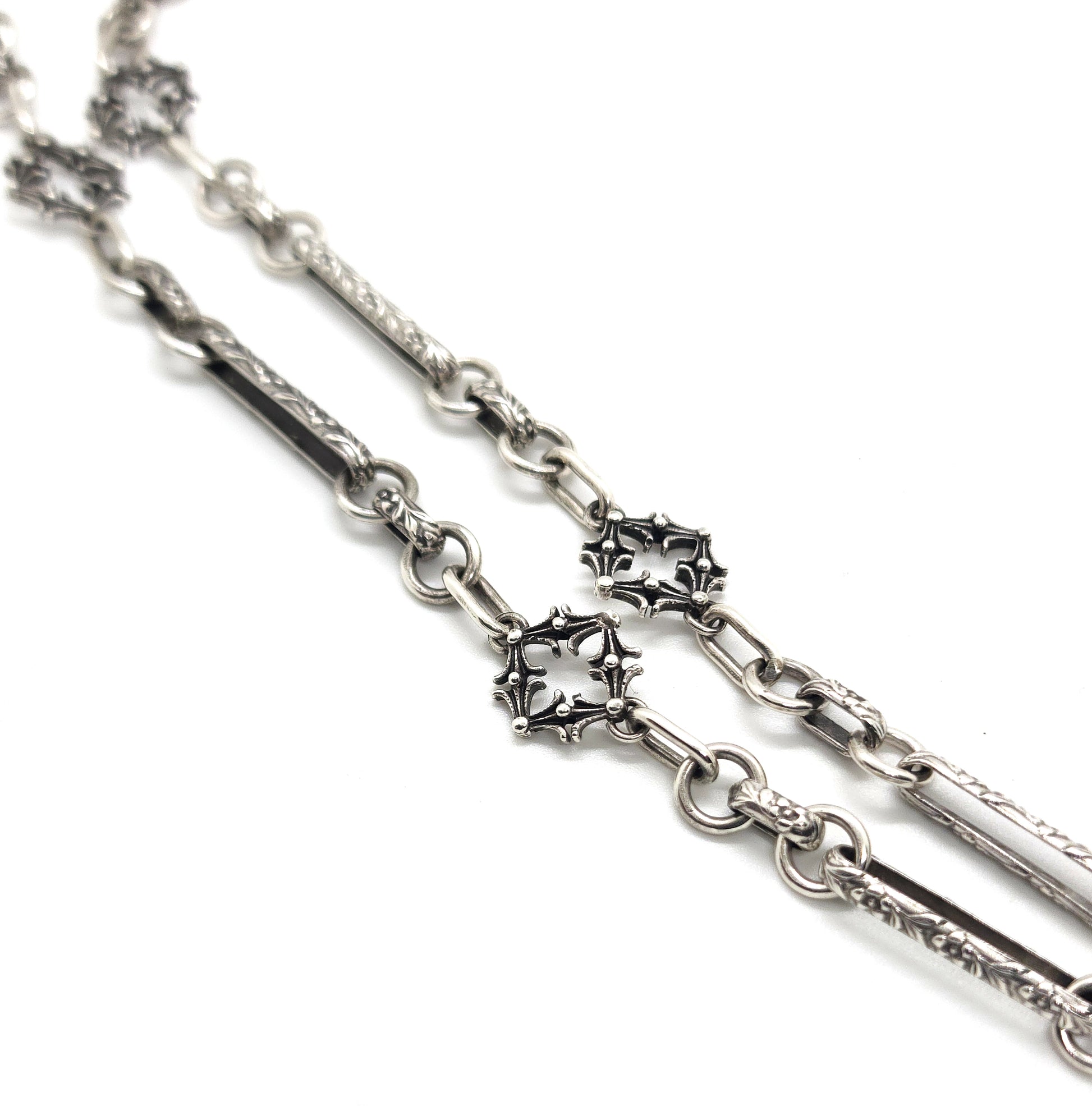 This silver chain, inspired by Victorian extravagance, showcases quatrefoil links and intricately adorned elements, complete with a snap ring at the front for attaching rings, pendants, or charms. Custom lengths are available, please email to receive a quote for your desired length